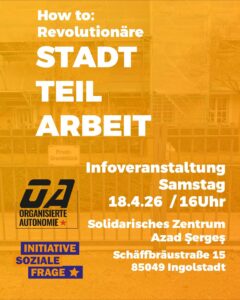 Am Samstag den 18.4. laden wir, die Initiative soziale Frage, ab 16uhr ins solidarische Zentrum Azad Şergeş zu einer Infoveranstaltung mit dem Thema „How to: Revolutionäre Stadtteilarbeit“ ein.